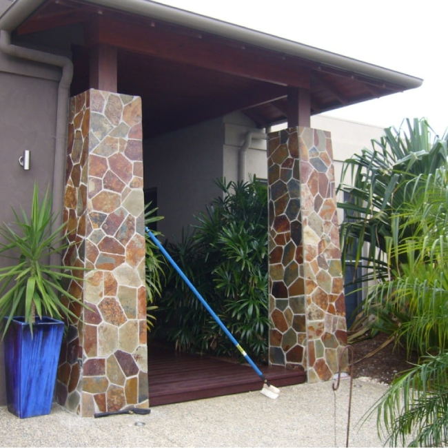 Our Sandstone Stone Cladding looks awesome on our chimney and portico pillars.