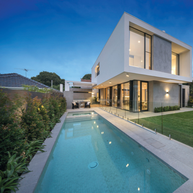 Raven Grey Granite pool edge coping pavers with contrasting Quartz crazy paving surround this pool renovation in Melbourne.